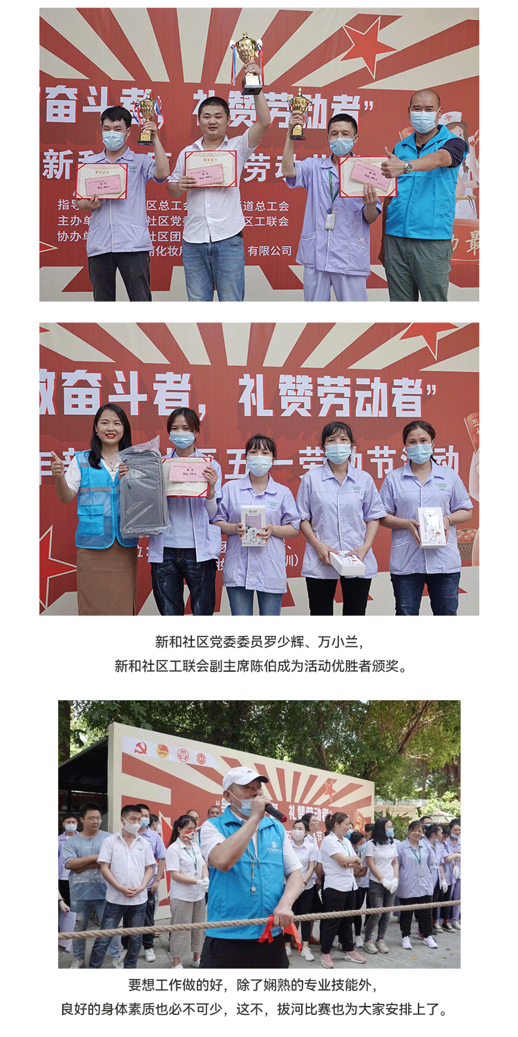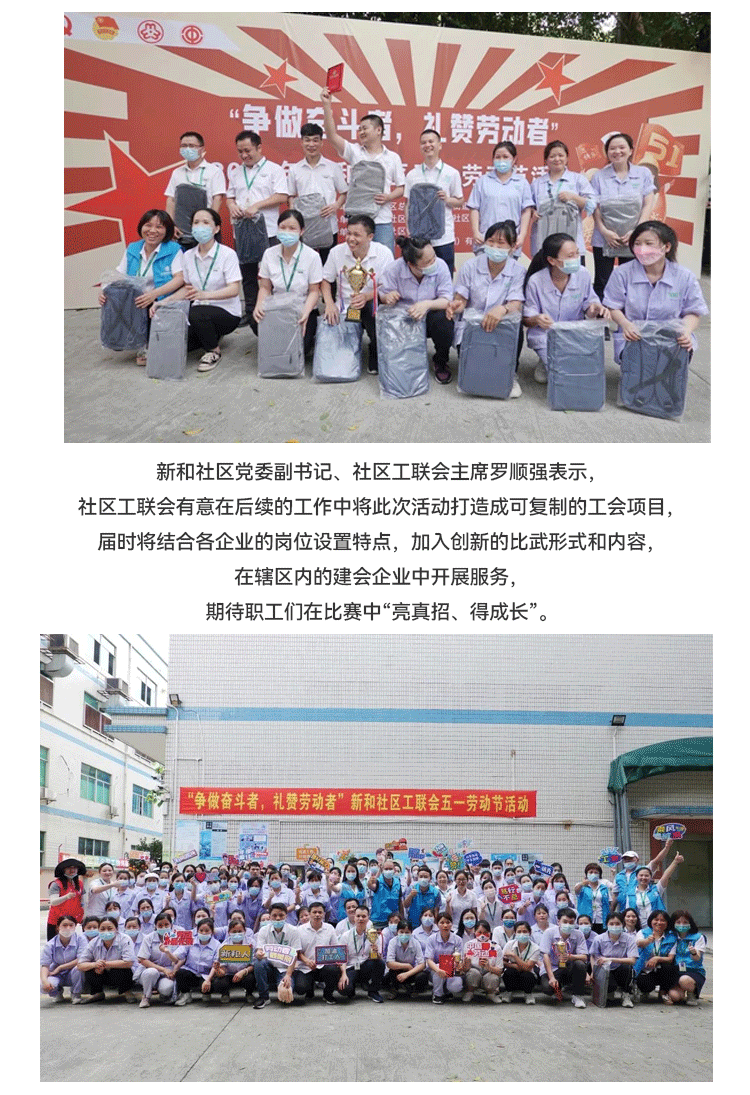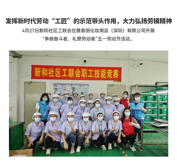 發揮新時代勞動"工匠"的示範帶頭作用,大力弘揚勞模精神;新和社區工聯會在黄瓜视频色情APP入口观看化妝用品(深圳)有限公司開展 “爭做奮鬥者,禮讚勞動者”五一勞動節活動。